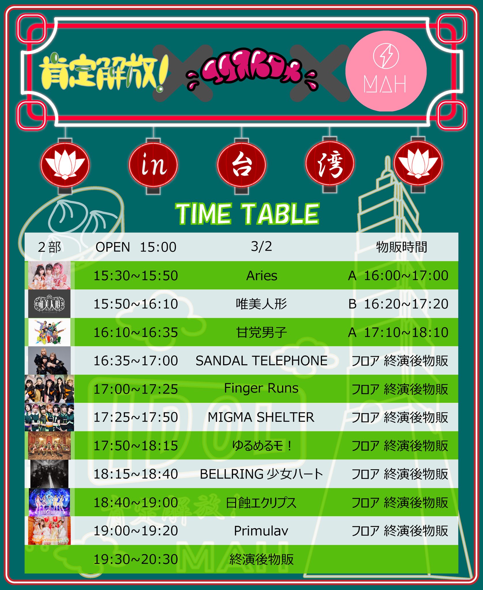 예전 베루하 타이반에서 보고 호감이었던 첫 번째 주자 유비닌교는 어째 3명이 아니고 2명만 나왔는지 모르겠지만(나중에 찾아보니 멤버 메노가 작년 12월부로 졸업한 듯) 악곡은 좋은 그룹. 두 번째 아마토우단시까지는 타케상의 긍정해방에서 계속 보고 있는데 잘 모르겠지만 타케상이 프로듀싱이나 매니지먼트니 뭐니 하는 그룹이 맞는 듯 하다. 멘즈 지하돌이 대만까지 온다고해서 뜨악? 했는데 나중에 보니 이날 같이 원정 온 일본 그룹들 중 에서는 평균 팔뤄가 제일 많았던 듯. (몰라뵈서 죄송합니다)