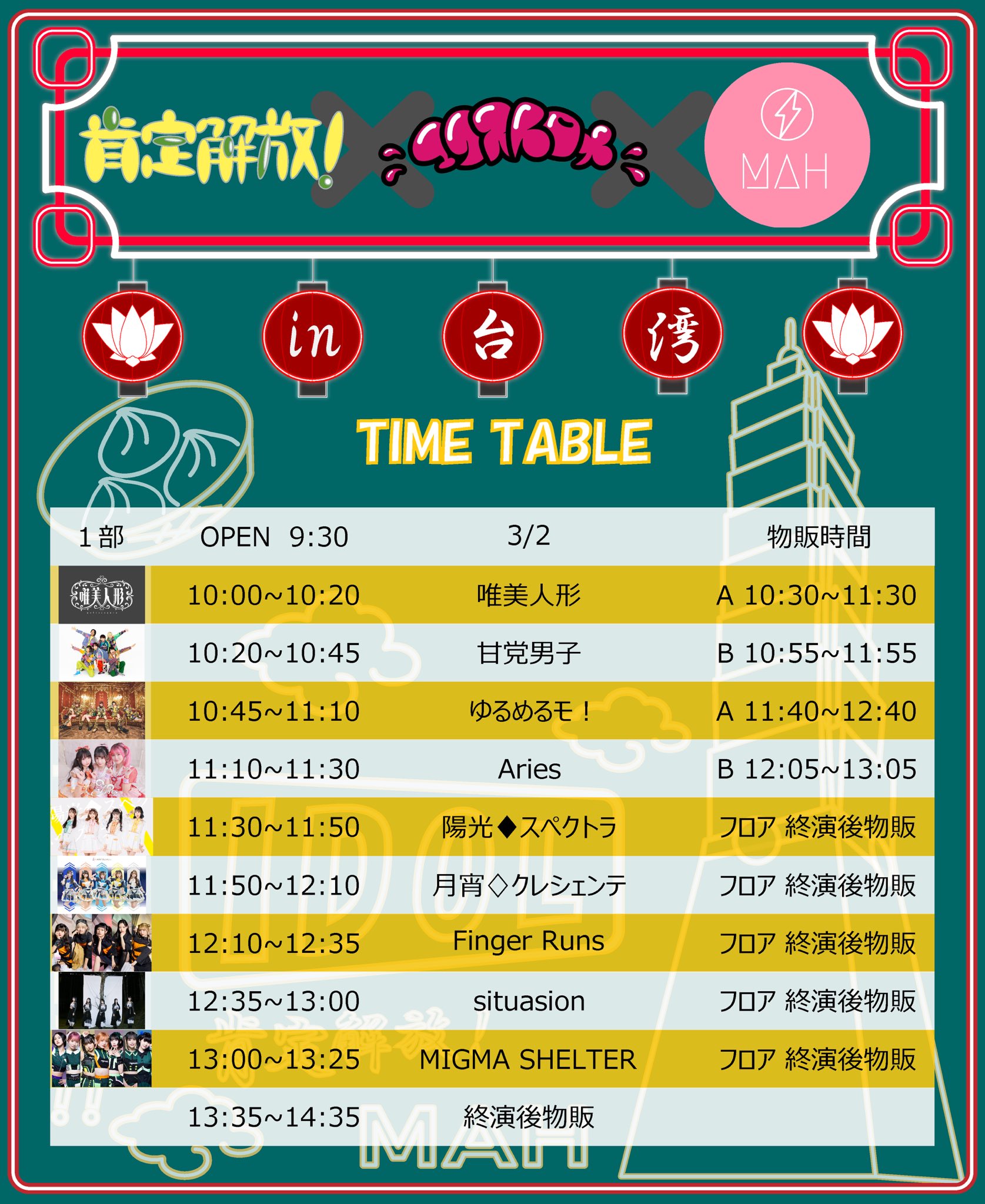 원정가는 팀하고 대만의 로컬팀들하고 섞여있기 때문에 타이테를 어떻게 짤지 궁금했는데 원정 온 팀들은 4번의 타이반 중 3개만 출연하고 나머지 1개 빌때 따로 나가서 쇼핑, 관광하고 돌아오고 오전의 토리는 일본팀들이 저녁 공연의 토리는 대만팀들이 맡는 방식이었던 듯.