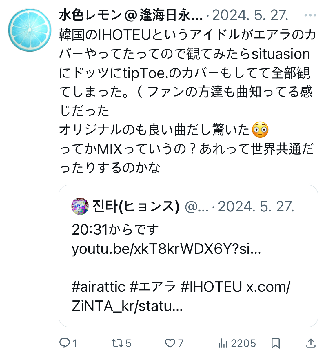 처음에는 「아, 뭐 그런 그룹이 있는갑다...」 하고 대충 흘러 넘겼지만 나중에서야 그게 악곡파라는 힌트를 준게 아닐까? 했음. 어쨌든 5월의 오히로메 영상에서 생각치도 않던 airattic의 환상선 커버를 보고 워낙 완성도 높은 커버라고 생각되었기에 그 다음주에 airattic 멤버들 특전회에서 네타로 신나게 써먹기도 했지만 정작 커버보다 관심을 가지게 한 것은 중간에 끼어있는 오리지날 곡들이었다.