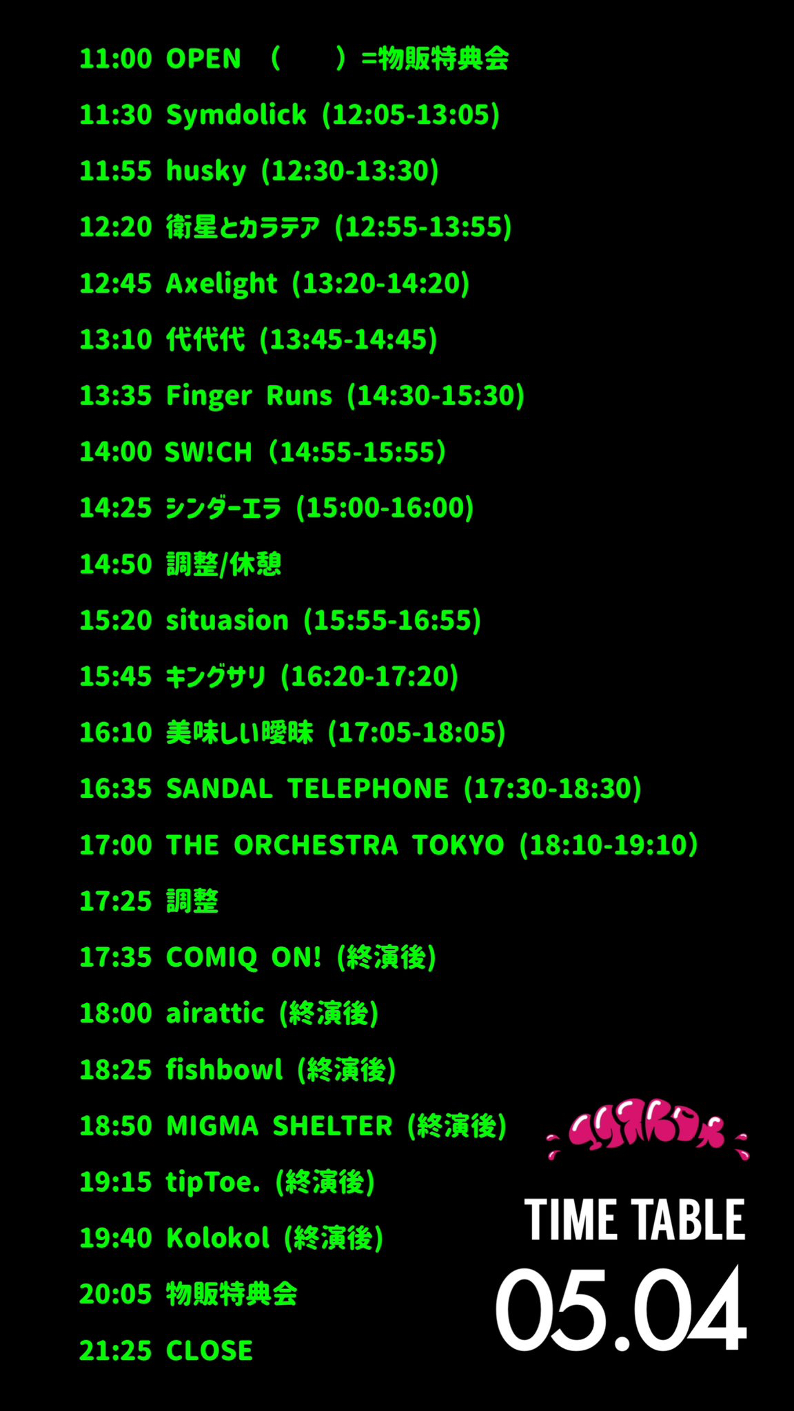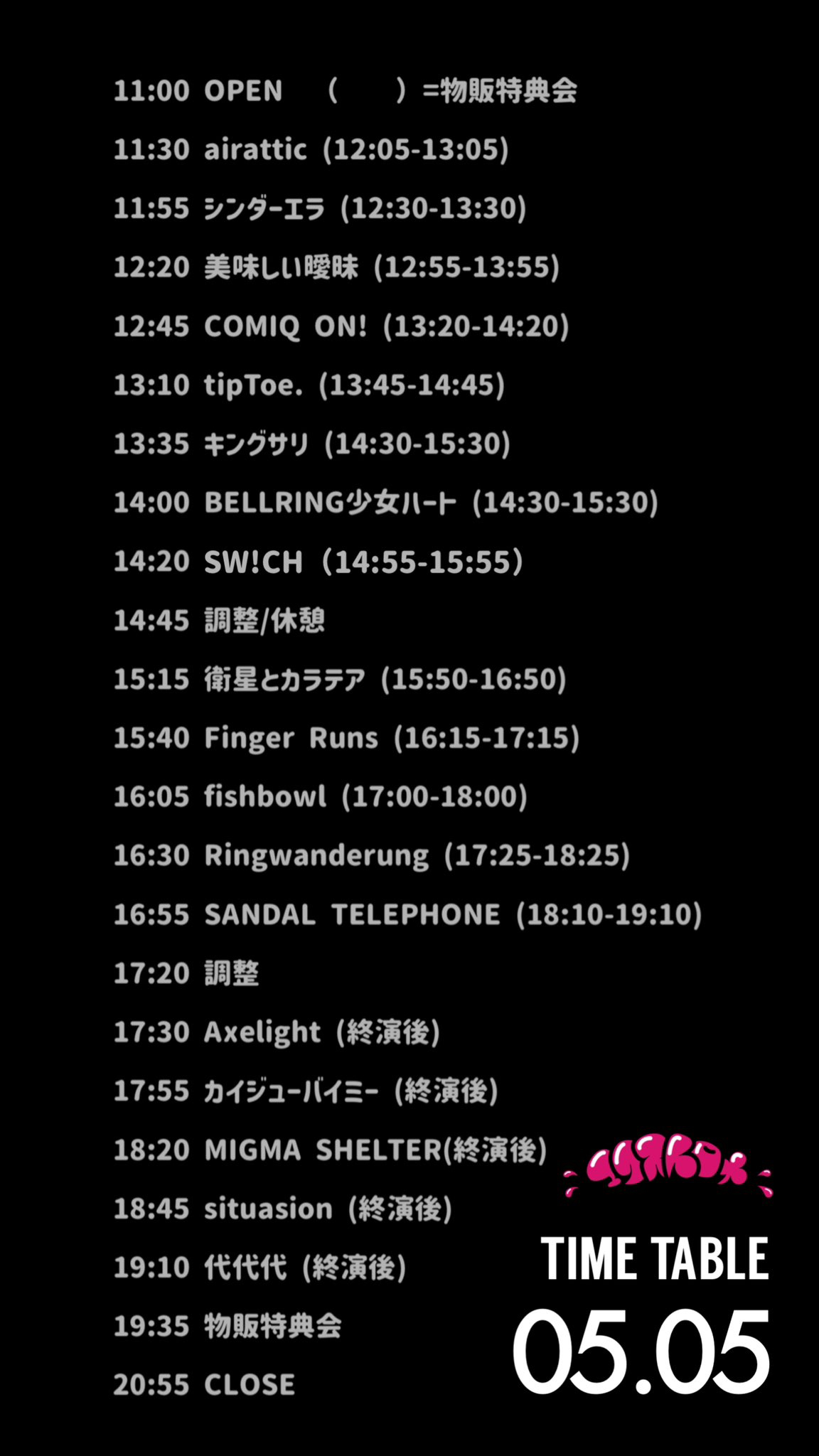 뒤돌아보니 정작 이 시점에는 몰랐는데 '23년 주 겐바는 이때 다 정해진게 아닌가 싶었을정도로 휘황찬란한 라인업이었다. 이 시점부터 코바켄상의 약칭 에쿠스토로메(Extreme!!) 모음? 계열? 이라고 해야하나? 주로 이쪽 계열로 주 겐바가 좁혀졌고 '23년 TIF를 거치면서 기존 WACK SLAVE는 없어지고 아래 5개 그룹으로 완전히 옮겨가게 되었다.