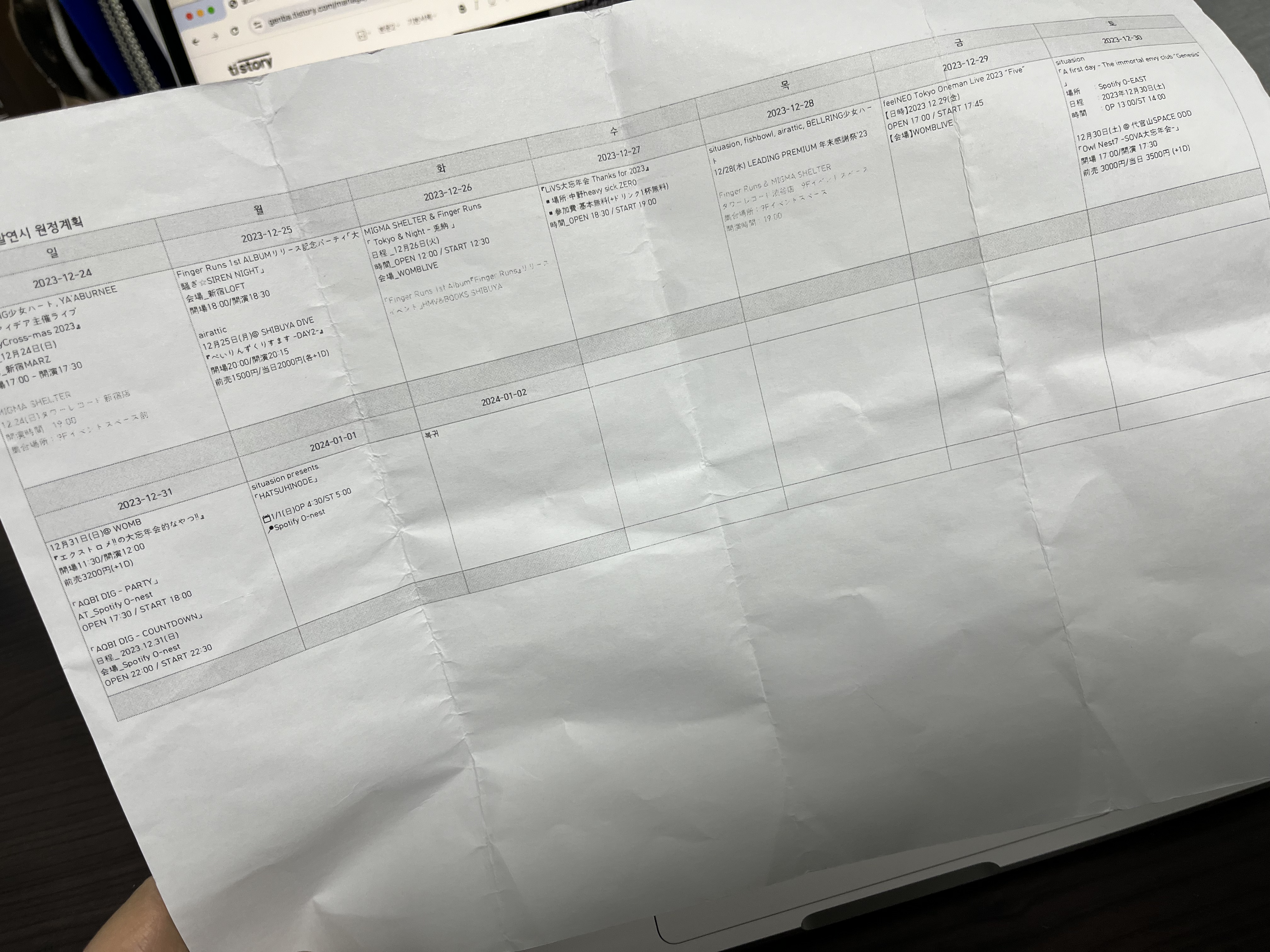 크리스마스 이브부터 시작해서 오쇼가츠에 끝나는 대일정을 잡고 주 겐바 사무소 공식 계정을 계속 체크하면서 라이브 일정을 계속 업데이트 해나갔다. 개인적으로는 원맨을 우선시 했기 때문에 '원맨 > 30분 이상 > 관심 그룹' 의 기준이었음. 올해 연말은 운이 좋게도 AQBI의 2개 그룹이 리리이베를 계속해서 진행하고 있었고 평소 관심 있었던 그룹들 원맨도 하나씩은 있었다. 제일 중요한 것은 서로 겹치지 않는 것인데 아슬아슬 한 일정도 있었지만 감사하게도 대부분 겹치지는 않았음.